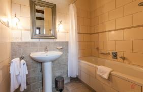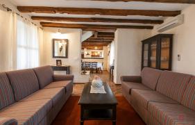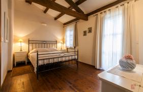 The house is equipped with rustic style design furniture. The kitchen is fully equipped, dining is for six persons, living room with fireplace. Bedroom on the ground floor has a terrace that offers views of the garden and a terrace with swimming pool. Both bedrooms upstairs have a balcony offering a view of the courtyard and pool. In each bedroom there is a bathroom, one with a bathtub and one with tub and shower.